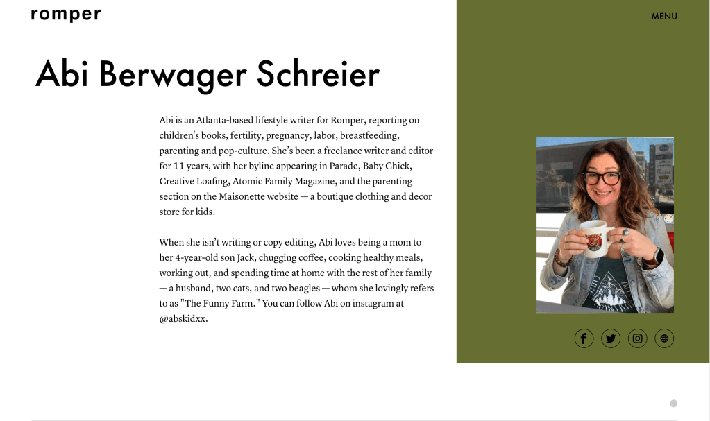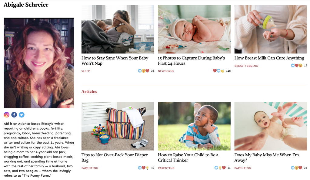 Abi writes about parenting viral news and trends, health, wellness, lifestyle, and pop-culture, including stories about mental and medical health, wellness, children's books, products (for humans and furry friends), fertility, pregnancy, labor, breastfeeding, and more. She also writes a great first-person essay and product roundup.